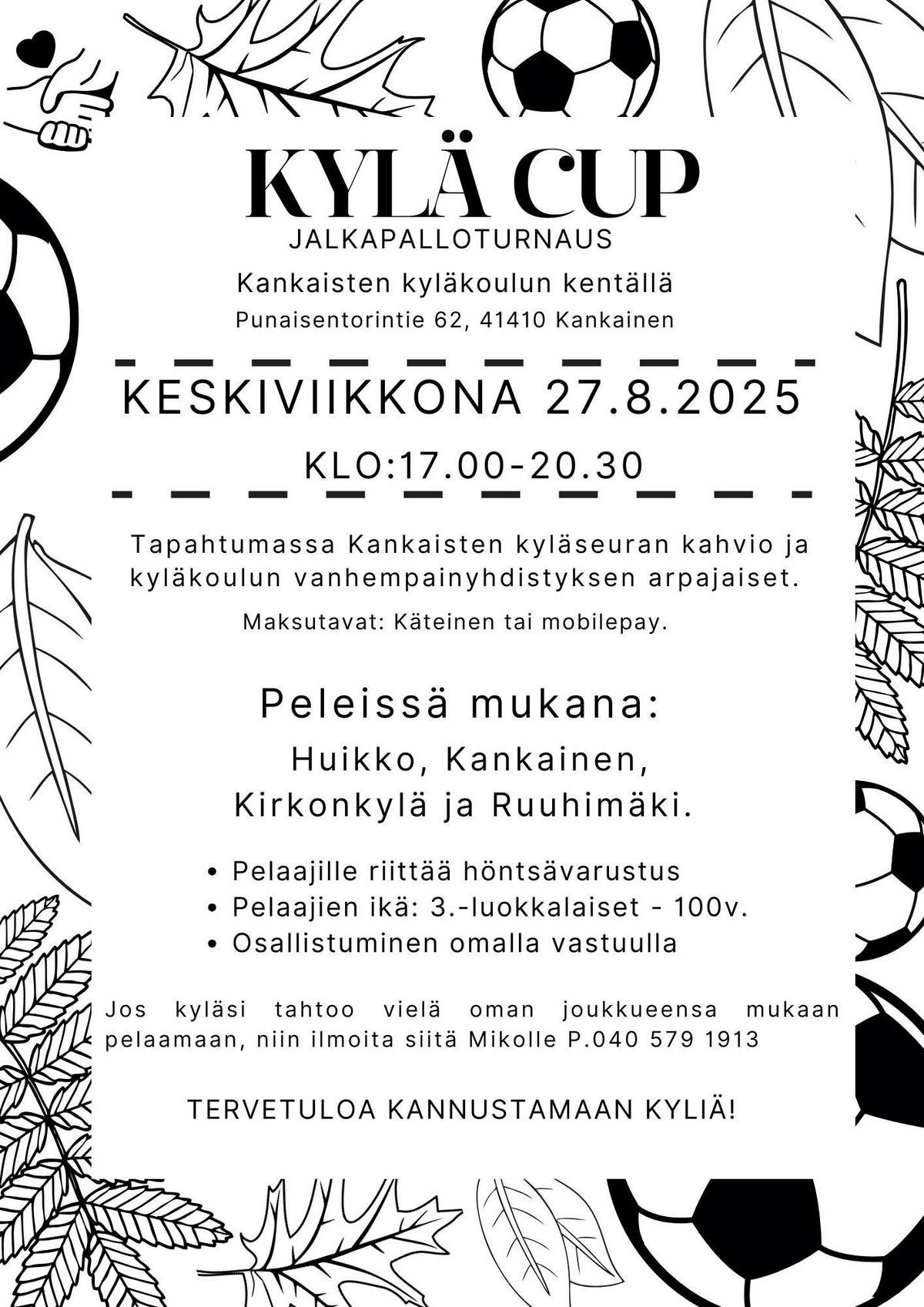 Kylä Cup tulee ja valtaa Kankaisten kyläkoulun kentän. Tule katsomaan kuka vie voiton niin jalkapallossa, kuin arpajaisissakin. Onko kioskissa myynnissä pillimehua ja sataako kaatamalla vettä, entä kuka tätä kaikkea tuomaroi?! Se kaikki selviää 27.8 keskiviikkona, tule paikalle ja tiedät mistä kylillä kuhistaan.
